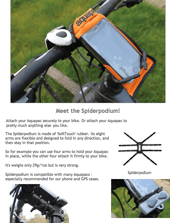 here’s yet another innovative idea from the folks at aquapac. a cool way to attach your water-proof aquapac for your iphone to anything you can think of. the spiderpodium retails for $20.