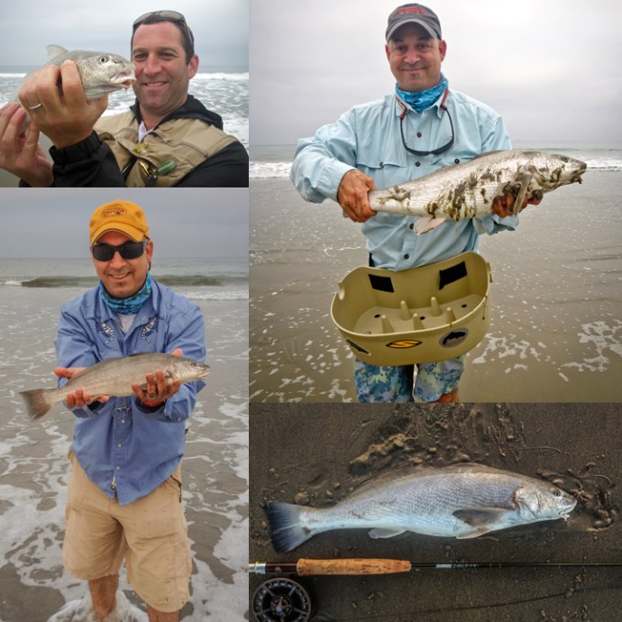well august is upon us and massive crab beds are still bubbling under the sand’s surface as summer’s slow rolling waves recede back to the sea. this is good for corbina but often times no good for the angler. me and friend, adam have found large schools of healthy corbina doing what corbina do, gorging themselves. in the last four days have hooked at least 7 and put five on the beach, unfortunately all of these fish were FOUL HOOKED. why? well, i believe there is too much food for these fish to want to aggressively grab a fly. we have been putting our flies right in their kitchen but to no avail. frustrating but still fun! all the fish we landed were all healthy fish with big fat bellies full of sand crabs. in past years i have witnessed the same behaviors. these fish get less grabby as we head towards the end of the summer. the first two, minus low tide cycles in july have always been money for fair-hooked fish in the past, with the second not as good as the first. maybe they are on some sort of spawn cycle, who knows? for my friend adam, who has just started fishing our west coast beaches, it has been a great lesson in sighting corbina, observing their shallow water feeding and behavior. it never gets old for me when you look over your shoulder and see your friend hooked up with a big smile on their face…the tug will always be the drug! hopefully this foul cycle will change and they will start eating our bugs…