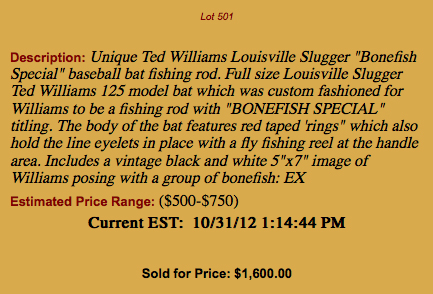 I am a big baseball fan and I have never seen this item before. It was a custom bat / fly rod by Ted Williams which sold at a recent auction for $1600. Ted Williams was one of the greatest hitters of all time. He was the last baseball player to ever hit over .400 in a single season. He hit .406 in 1941. What most people don’t realize was he was also a hall of fame, fly fisherman and loved to fish for bonefish in the keys. He was quite an angler. How cool would this bat/rod be hanging in your fly tying room?