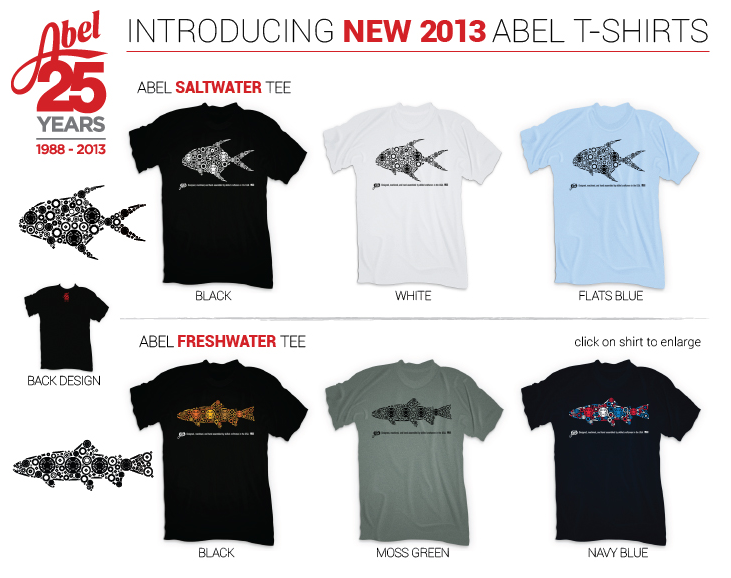 I am very excited to see these new tee shirts designs hit the street. Abel celebrates their 25th anniversary this year. I have been the proud owner of many of Abel’s quality products over the years and like the fact that everything they do is manufactured right here in Camarillo, California. I got to tour their facility a month ago and was very impressed by the fine attention to detail in every thing Abel puts out, from nail clippers to large arbor reels. Their hand-painted series reels are amazingly done one at a time by skilled artists. Everyone as unique as a snowflake.