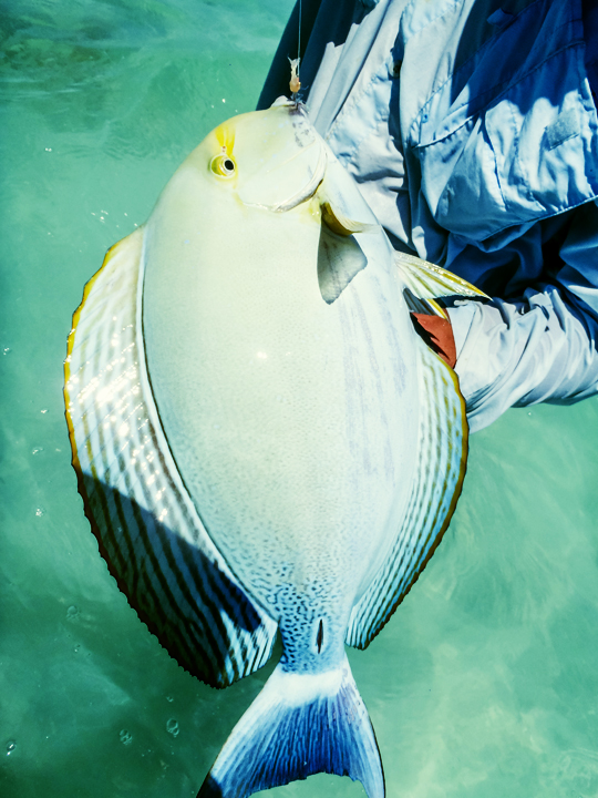 We choose the full moon November tide for our week because I was told it could bring monster spawning bonefish onto Paris Flat and it did. Three days after the full moon, large female bonefish and some of the smaller boys school up into large brown clouds that move slowly across the deep flat. Throwing a fly anywhere near this cloud can produce a 4 to 12 pound fish. You literally see all these bonefish heads lifting out of the water to chase the fly. We hit it right! It is a memory i will never forget, all our guys with bent rods walking fish back to the beach. The best part was as the school drifted out of casting range we deep waded onto coral heads, (similar to montauk rock hopping) stood up and casted to the cloud, hooked up, jumped off the coral and waded back to the beach landing big bones to ten pounds.