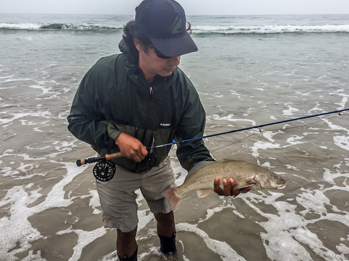 It’s really nice to see some beans coming to hand. This is a great week of early minus low tides to give it your best shot. Our good friend and Sage, Smith and Rio rep, Alex Ramirez with one of two corbina landed this morning (somewhere in San Diego? LOL) on a olive sculpin pattern. Alex was fishing the new Sage Salt series fly rod. Way to go brother! I casted these Salt rods and they are awesome casting and fighting tools, perfect for inshore and beach fishing. I personally fish the older Sage 7wt ZAxis with a custom t-8 (approx 27 feet) attached to an Airflo intermediate running line. This morning I went zero for two, I had one really good take, which peeled drag as the fish raced across the shallow flat like it was water skiing then unbuttoned, the second take happened just as I was going to lift my rod to make another cast, the fish stopped the line in an inch of water then popped off. oh yeah, that is corbina fishing, not corbina catching. You must embrace the pain and move forward, tomorrow is another day. 🙂
