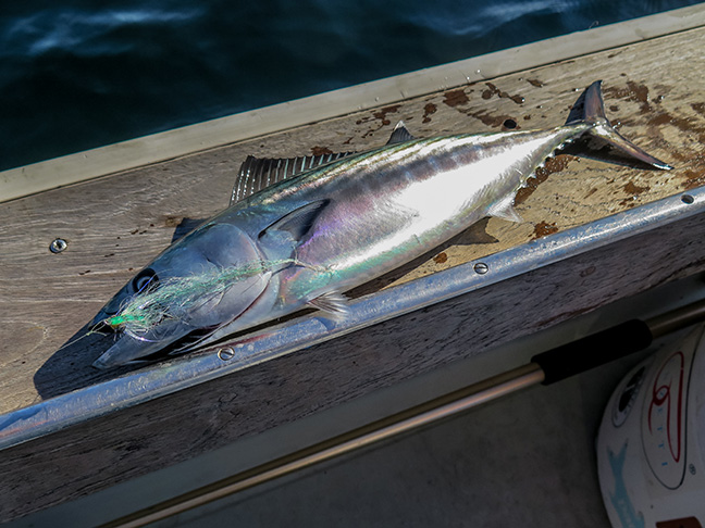 Despite warm waters our local inshore fly fishing has been pretty damn good for local species like calicos, juvenile white seabass, barracuda and bonita. Me and my buddy, John Whitaker ran out of Redondo Harbor, Saturday o’dark thirty to get in a little local action in before the start of our weekend. John had pre-fished the day before so we kind of knew we were in for some quality calico fishing and lucky for us, history repeated itself. We charted 72 degree water temps just outside the harbor and as soon as we swung around the corner towards PV the water dropped to 69 degrees. We got to our destination as we slowly tried to avoid all the lobster traps that littered the surface like land mines in the dark. Our first casts we immediately greeting with bent rods. The fishing was steady with all quality bass to 18 inches until the lights came on, then it slowed down, probably due to the slack high tide. You need current and moving water to keep the bass on the chew. Got a few small white sea bass mixed in on the fly before we quit and headed back home towards the whaling grounds. John said there were some humpbacks and finbacks working bait inshore and if we found them the bonita would be on em like white on rice and he was right. We doubled up when we got close to the whales, sea lions and dolphin working bait less than a mile off Torrance beach. It was like the Discovery Channel, I was trying to shoot photos while trying to land bonita, finally I had to put the rod down and shoot a few pics of these magnificent creatures… a great, memorable day fishing the fly in October.  We were back at the dock having a cup of coffee at 10 am! Welcome to California in October…