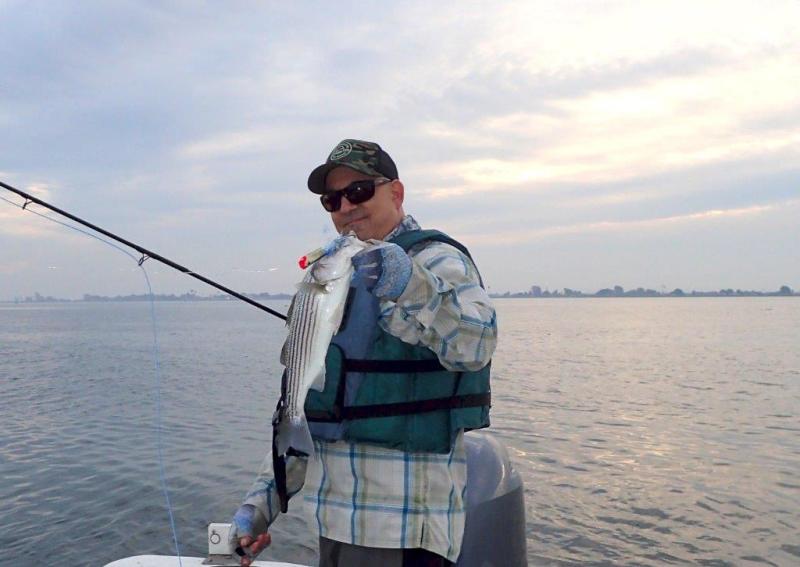 Little striper landed on a surface popper just at dusk. photo courtesy of Dan Blanton.