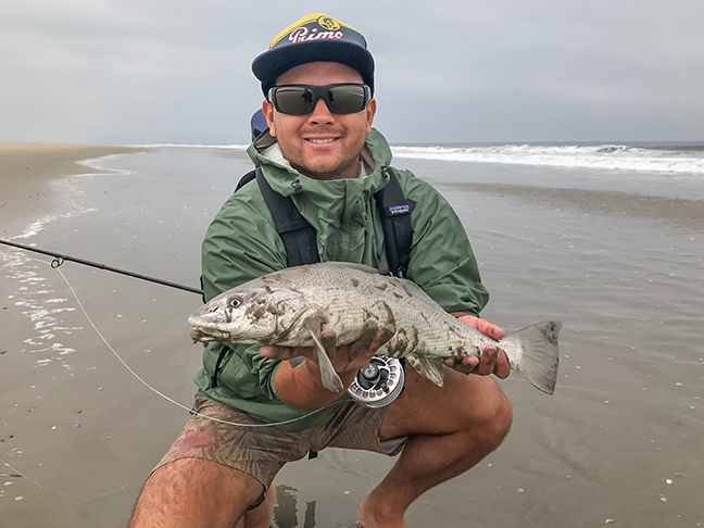Bobby Izuda from Hawaii lands his first corbina on a grey merkin which he tied for the first time the night before. WTG dude!