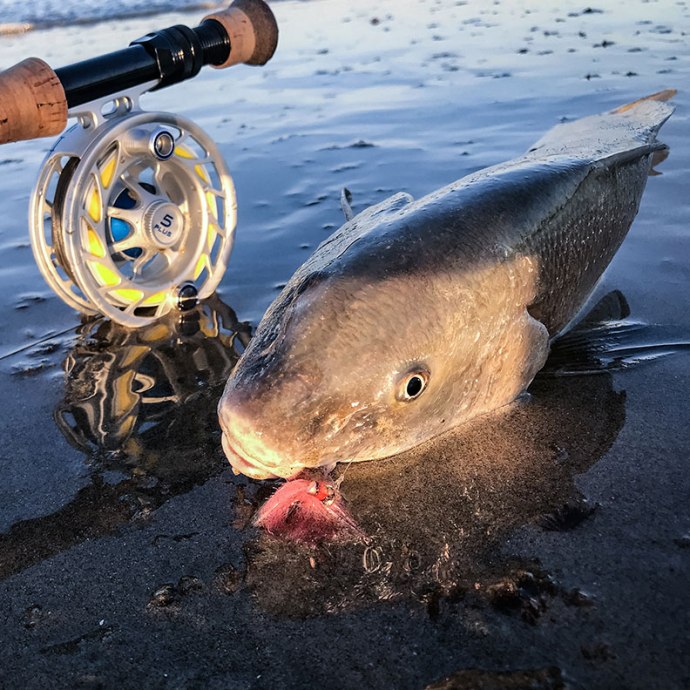 This fish was caught in what I refer to as liquid structure. The flat I was fishing this morning was as flat as a pool table with no visible hard structure. This can make for a long, frustrating morning, when there is no place to hold fish. So where to you fish if the Corbina can go anywhere like loose pool balls on a hard slate table? You look for anything that is slighty different. I noticed as the tide started to push there was only one spot on this gigantic flat that had two seams crossing each other as moved towards the shore. This is what I refer to as,”liquid structure”, Often times, the fish will use this extra 6 inches of water like a kiddie slide to propel them toward the shallow end of the pool as the tide begins to fill in the flat. Focusing on this area of the flat allowed me to toss into a group of about five fish moving towards me, and lucky for me, one ate the fly. So the lesson here is you have to create your own luck by concentrating on areas that hold promise. The fish ate a size 6 pink, Holy Moley.