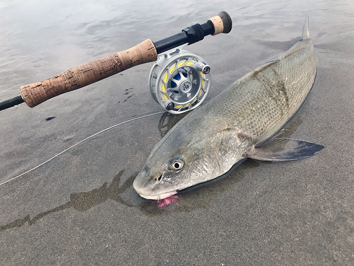 photo by Al Quattrochi. This fish ate the fly right on the edge of a crab bed almost exposing his head on dry sand.