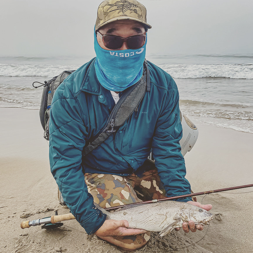 My friend Colin Sako getting it done with a pink Holy Moley fly and an old school Tom Morgan fiberglass rod. It was special for me to watch him land his first fair-caught corbina. For those of you at home a fair-caught corbina is a fish that legit eats the fly in its mouth. That’s what makes it special. We never post fouled fish on this website. We like to do it the hard way. LOL This fish was released immediately after the pic was taken. Photo by Al Quattrocchi