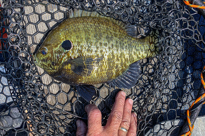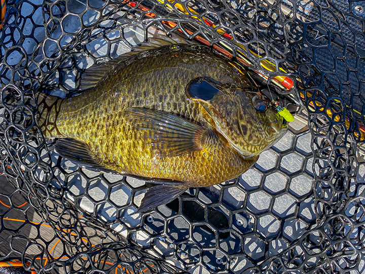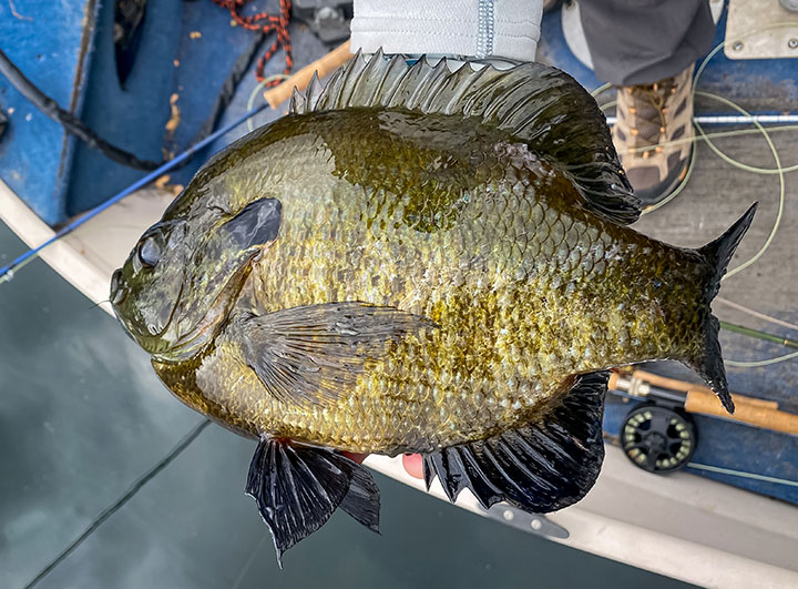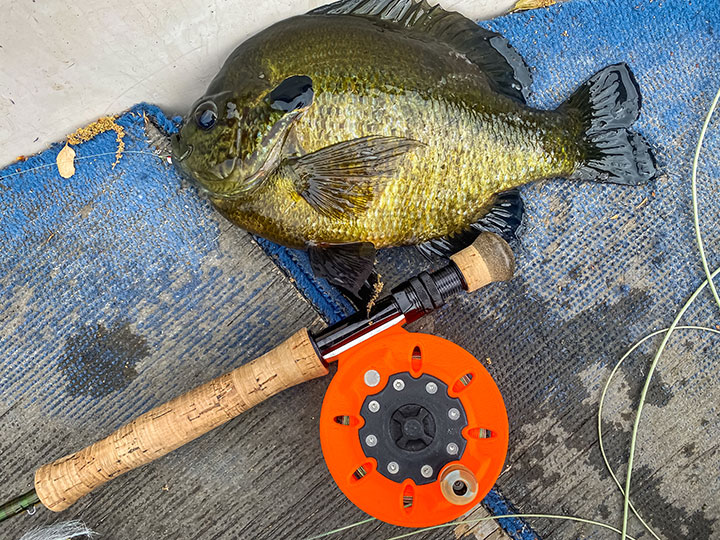 I was off base when I referred to these fish as big bluegills or gillzillas, until my friend Greg enlightened me. They actually are Redear sunfish and will readily take a small balanced leech style fly under an indicator. Here’s the difference. Redear sunfish have a more gold and green coloration with faint vertical bars, while bluegills have more yellow or orange coloration. The main difference between the two is their operculum colors. The bluegill features a deep blue or black color while the redear sunfish has red or orange tips near its head. I learn new stuff every day on the water… – Al Q