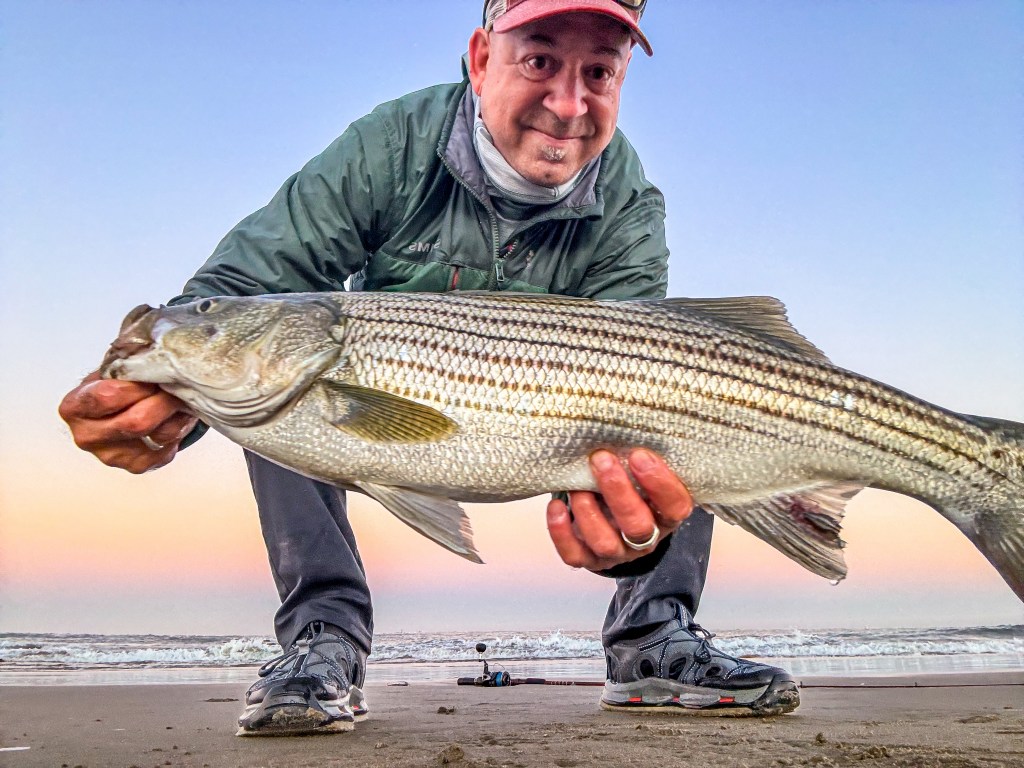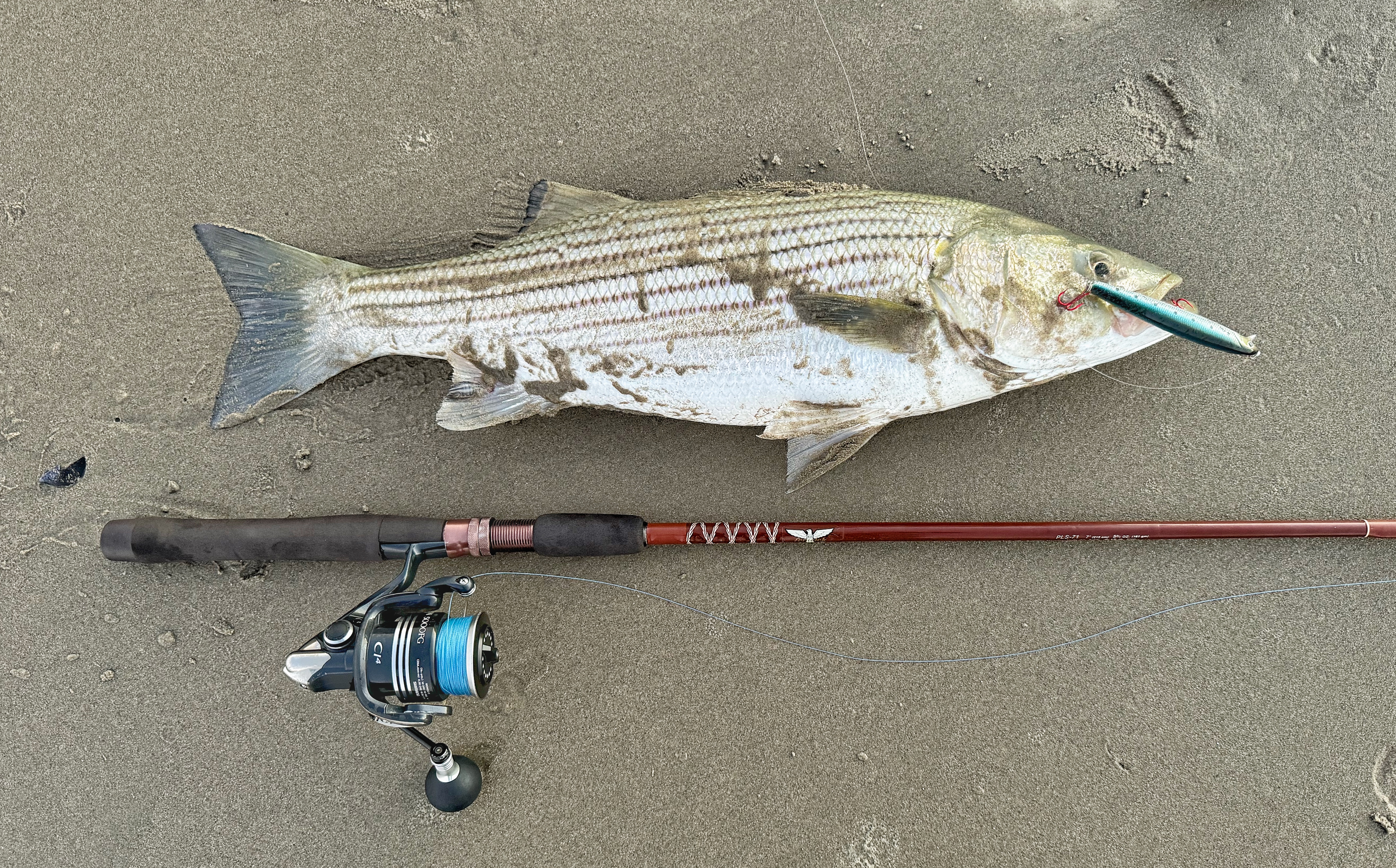 Ok, I have to admit that I did had a premonition this morning. There were a few good reports up and down the coast that fish wearing pajamas were swimming in the local surf. It felt right. The tide on the beach looked good with a .6 ft swell off a full moon. I set my alarm at 5:30am to take advantage of the first half hour of early light, maybe I get lucky? If it was going to happen it was going to be at low light. I was solo, no one out there except yours truly. Back at the parking lot, my friend Tony was jamming on his trumpet as the sun began to rise out over the eastern horizon, he could be heard from a distance. Being on the sand early in the morning always makes me happy. I made a few exploratory casts and decided to move. The water had some salad and I needed to find a cleaner stretch. As the sounds of Tony’s jazzy trumpet echoed across the distant sand, I made a long cast just behind the oncoming set of waves and on the third crank of the reel handle, it was hammered violently and came to a halt. At first thought I said maybe its a big halibut, but after the fish took off I realized it was not a halibut. The beauty of fishing the surf is always that unknown, that anticipation of what it might be? So I am hooked up as the sun is rising, listening to a live jazz soundtrack and it feeling like I’m in a Fellinni movie. After a quick battle the fish was slid onto the wet sand, photographed and released unharmed. What made it even more special was I landed this fish on my dad’s old fiberglass fenwick spinning rod! A classic! I miss fishing with him. Moral of this story is I rallied to fish even though the odds were never in my favor. Stripers are routinely caught up and down our coastline but actually targeting and catching them is built on perseverance, luck and good karma. I used the standard LuckyCraft 110 minnow, I usually customize them by replacing the factory trebles with red EagleClaw #4s and use only a front and rear hook, no middle hook. I used 15# Cortland braided line with a top shot of 15# Maxima mono line. Retrieve was a slow roll. Karma was good, and stoke was high! stay with it –Al Q