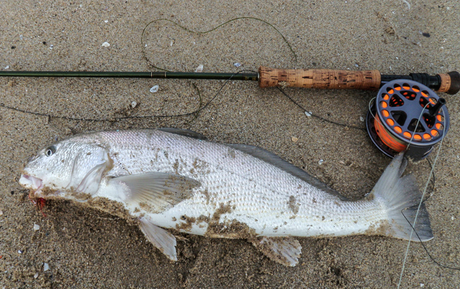 After watching all the fine haibut being caught in huntington beach on saturday’s one surf fly, i really got pumped up and decided to hit one of my favorite halibut holes in the south bay early sunday morning. I had hooked a nice halibut about a month ago in torrance that I dropped at my feet so I made sure this time, my hooks were sharp and went with straight 12 pound tippet. the fly i used was a red, orange and brown clouser tied on a #4 mustad. The hole I was fishing was almost exposed so I had to wait an hour or so, for it to fill in on the rising tide. Once It filled in I got two small halibut around 20 inches each to eat the fly, fair hooked and released. mission accomplished, one small perch later I called it quits and went home. i met a really nice guy name Mitch who watched me land one of my fish. I had heard there was a big perch landed around a month or so ago and totally by coincidence it was Mitch’s fish. It was a 17.75 inch perch that he got using a lucky craft anchovy lure. I asked Mitch if he had a pic and he sent me one on his iphone. We have had some really big fish in the surf this season, but this was the biggest perch I have seen this year! check it out!