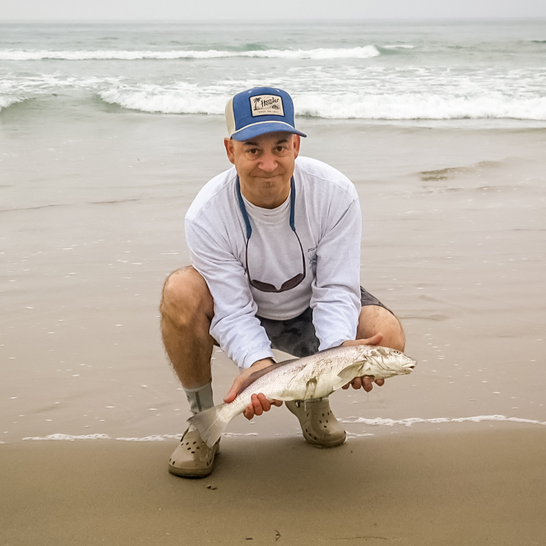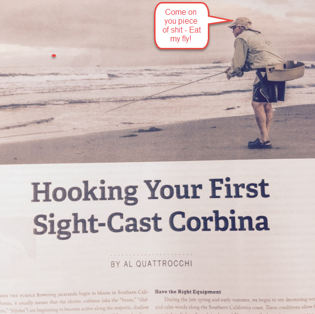 After willing myself to an early rise I found a small group of finicky feeding Corbina this morning. The overcast, poor lighting conditions made positioning the fly a little more challenging since it was hard to see fish until they were literally on the doorstep. This is when you need to be way back on the beach to make a good cast. The corbina were right where I thought they would be, feeding right at the end of the wave foam, sliding over a small crab bed in inches of water. After three solid bumps and a few choice words I finally got one to stick. Glad I sharpened the hooks last night. At first I thought this fish was fouled by the way it fought, I couldn’t turn him. He fought especially hard in shallow water and never ran long, dogging me every time I got him in close. After around ten minutes I surfed him onto the sand and saw my fly under his lip. He was revived and released to fight another battle on another beach. This is the best time to try for corbina with a fly. It is my favorite time of the year…