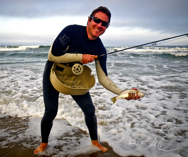 Howard Schecter is all grins after landing a surf perch on a beautiful Sunday morning near LAX. photo by Al Q